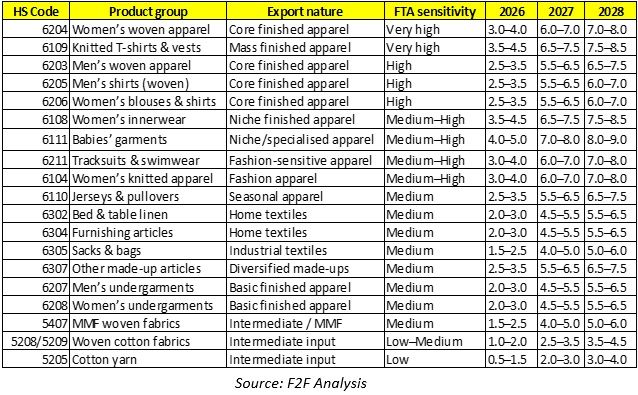Export growth in 2026 is expected to remain moderate as buyers focus on audits, compliance checks, and limited pilot orders ahead of implementation. A clearer divergence is expected from 2027, once tariff concessions take effect, with finished apparel emerging as the most responsive category.