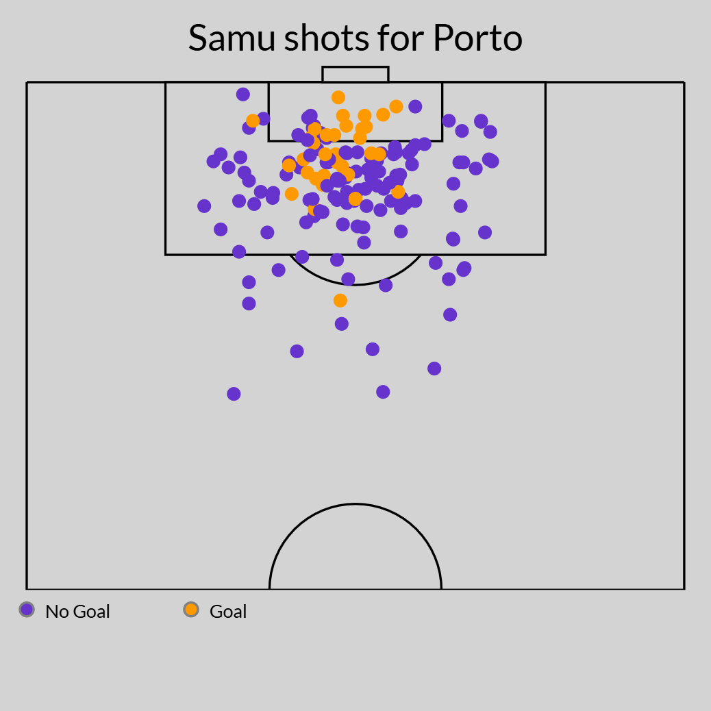 Arguably one of the most exciting center forwards in the European game, Samu is a modern No. 9 striker whose game is as much about imposing himself on center backs as it is about finishing moves. While his 6-foot-4 frame suggests he is an obvious target man, it’s equally interesting how often he turns those physical attributes into repeatable shot volume (3.13 per 90, at an impressive 60% accuracy). Indeed, data models consistently place him among the most frequent and highest quality shooters — 46 goals from 70 appearances for FC Porto — in Europe’s top leagues.