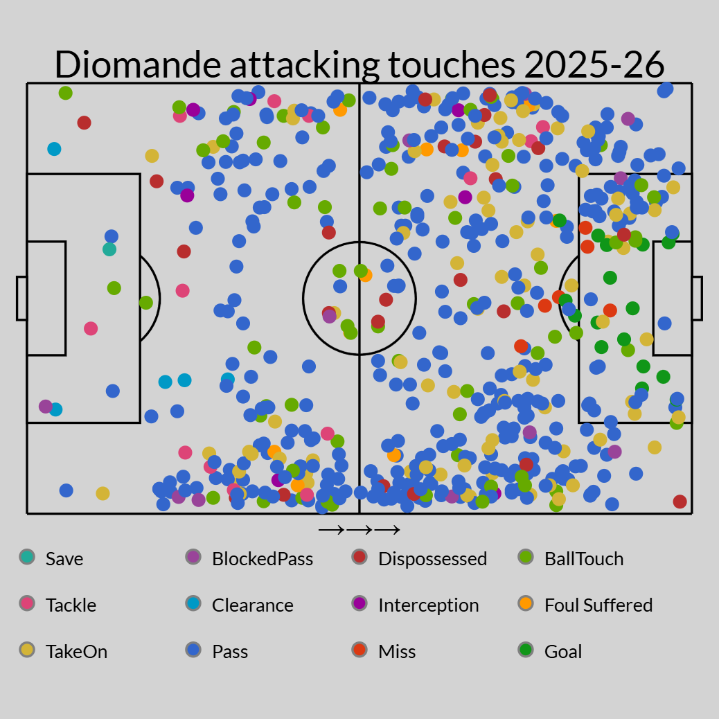 Furthermore, his forward momentum regularly carries Leipzig into dangerous areas. His 4.5 touches in the opposition box (per 90) highlights how often he arrives in positions to create opportunities, and he has scored seven goals himself across all competitions.