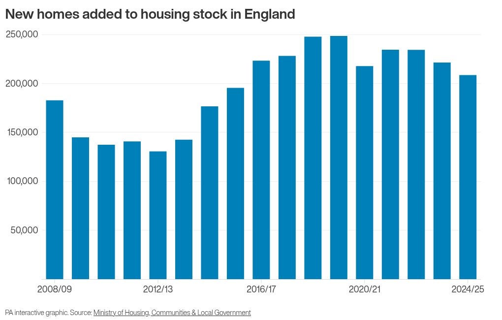 Keir Starmer has promised to build 1.5million new homes in five years, an average of 300,000 homes per year, but official figures show just 208,600 were created in England in 2024/25, down 6 per cent from 221,409 the previous year.