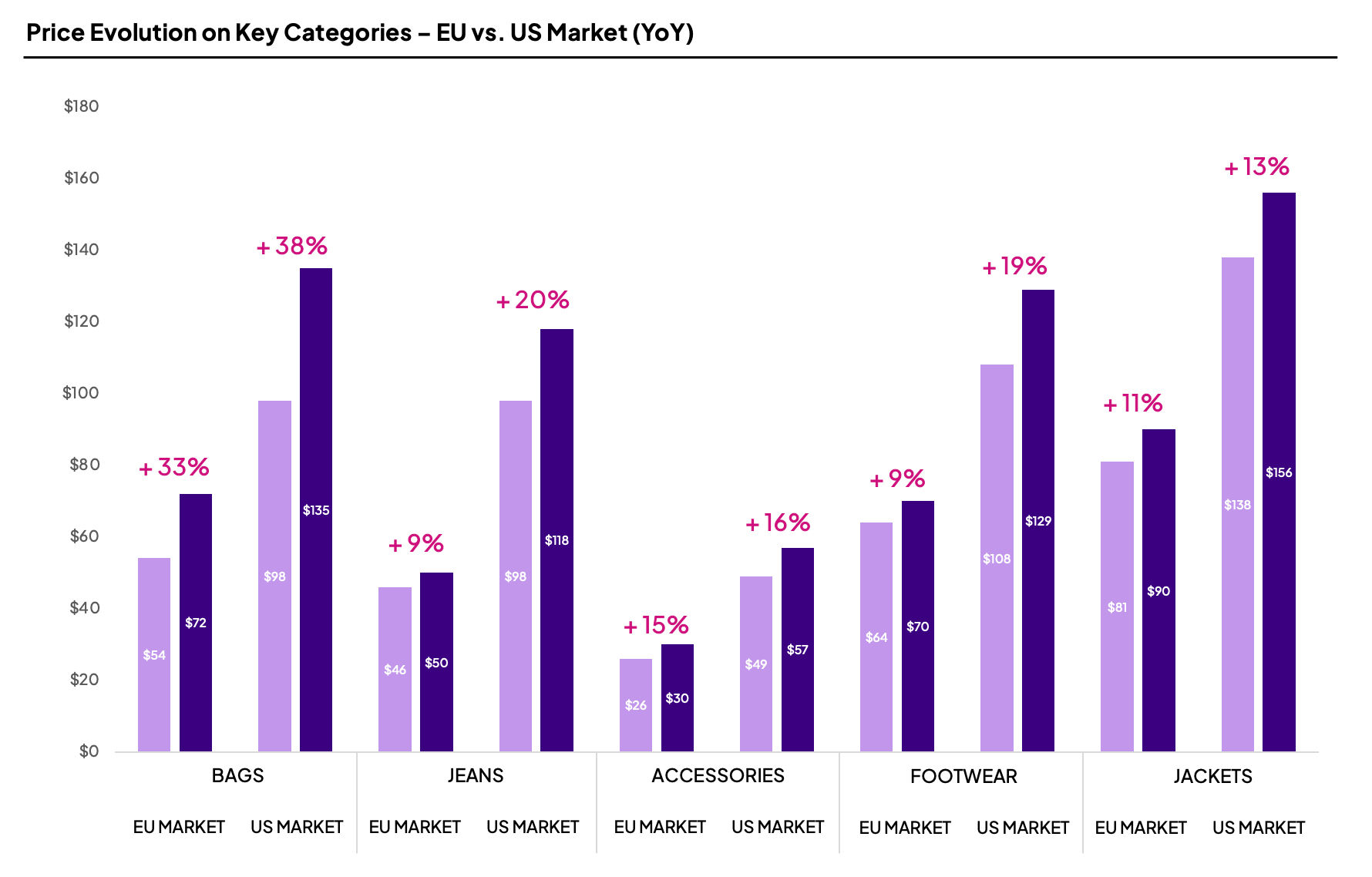 For the Fall/Winter 2025/2026 season, the Retviews study shows a general increase in prices for both Europe and the United States. However, not all product categories have increased to the same extent: